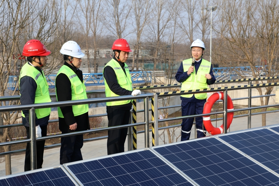 陈得信先后前往生物池、超滤膜车间、生态环保教育中心等核心区域,听取良乡污水处理厂“六位一体”综合性节能环保示范项目情况汇报,实地考察自主研发的膜曝气生物膜等技术应用情况,了解高品质再生水处理与污泥资源化利用成果,观看实时数据与智能管理演示,察看进出水、污泥产物等实物样品,对“污水变清流、污泥变资源”的循环利用成效给予高度评价。